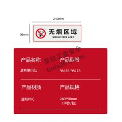 首页> 安全法规合规标识> 提示标识> 透明警示贴 透明PVC膜背胶贴 10张/包 无烟区域98163 包 240×90mm