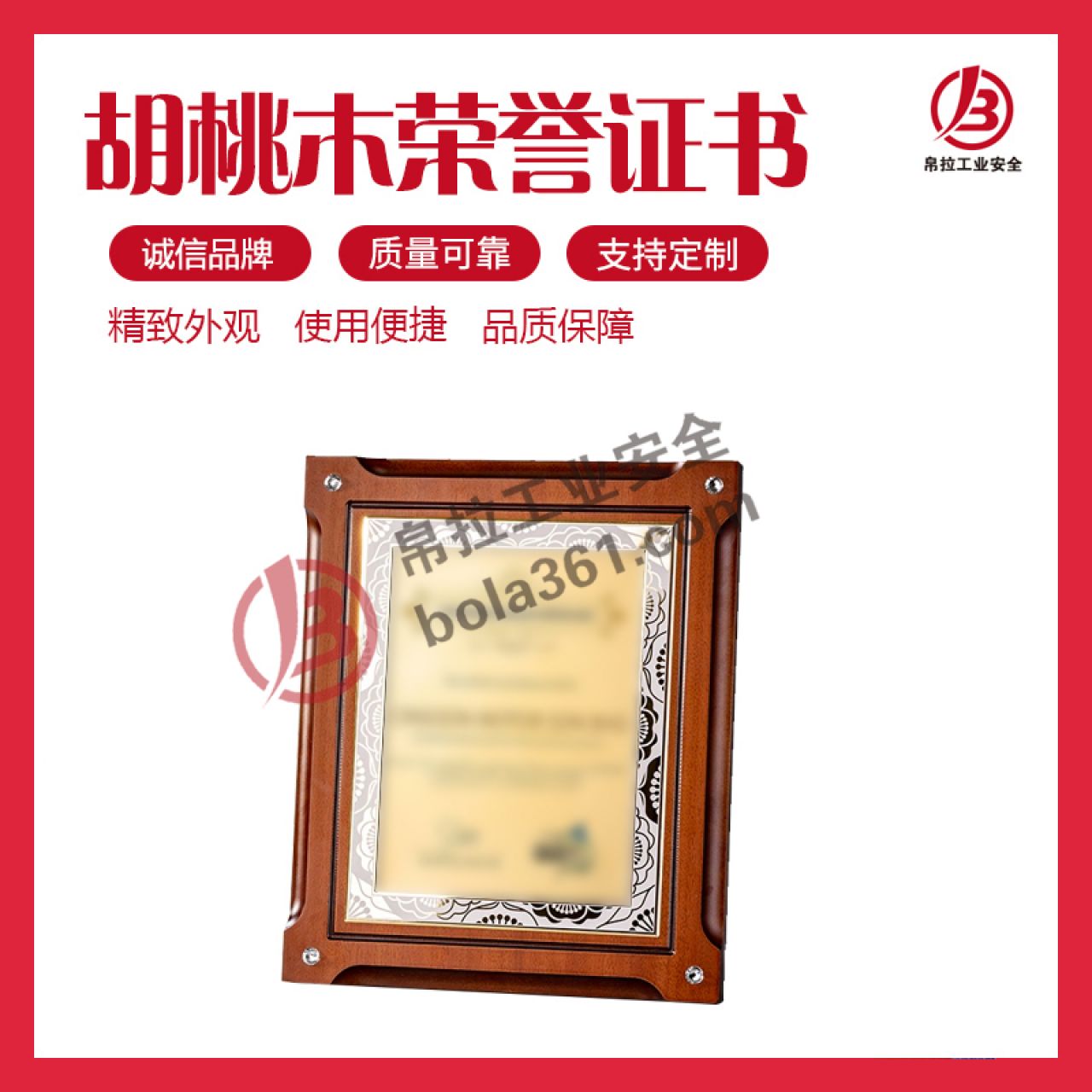 胡桃木荣誉证书 250×300mm 胡桃木材质